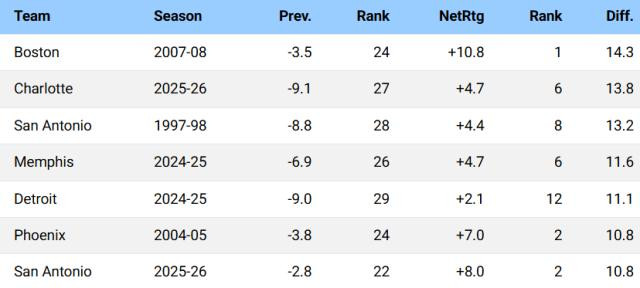 戒指本日赛前,黄蜂本赛季百回合净胜敌手4.7分,雅博体育app排在联赛第6。要知说念上赛季黄蜂还以-9.1的百回合净胜分排行定约倒数第4。短短一年时辰,黄蜂将百回合净胜分进步了13.8分,小九体育在线直播官网这在NBA插足play-by-play数据期间的30年里高居第二,仅次于2007-08赛季构成加内特、皮尔斯、雷·阿伦三巨头的凯尔特东说念主(进步14.3分)。