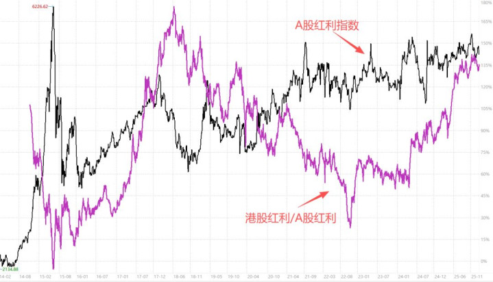 咱们再轻视看一个比值。下图黑线是A股红利指数走势,紫线是港股红利相对A股红利的比值。