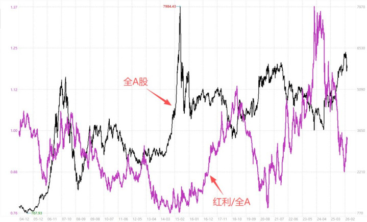 下图黑线是昔时20年A股举座走势。紫线是红利股相干于A股比值(即「红A比」)。紫线进取暗示红利股走强,向下暗示A股走强。