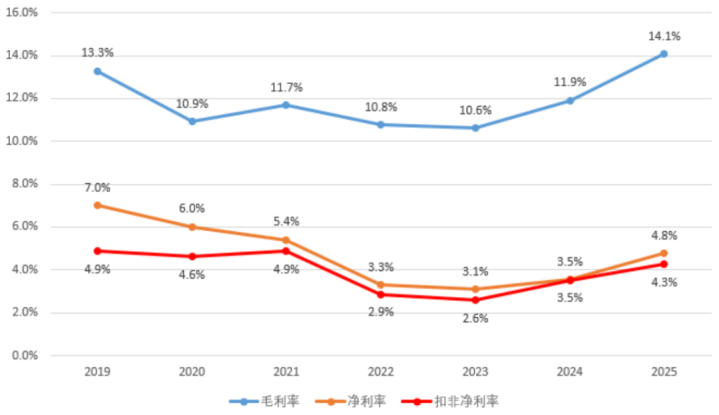 年内抽象毛利率14.1%,同比升迁2.2个百分点;净利率4.8%,同比升迁1.2个百分点,且较同时行业均值跳动2.9个百分点;扣非净利率也有4.3%,同比升迁约0.7个百分点。