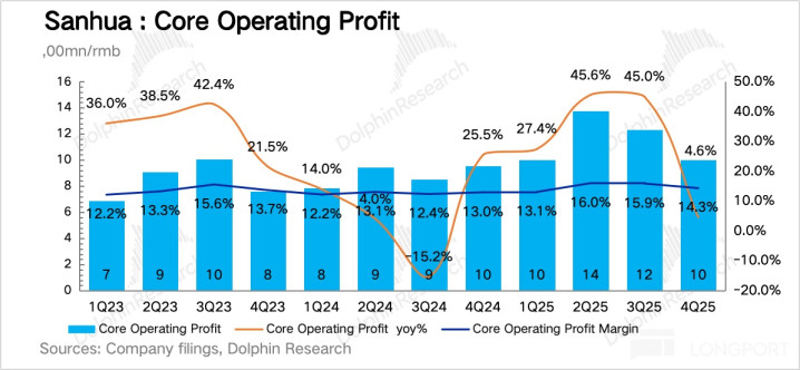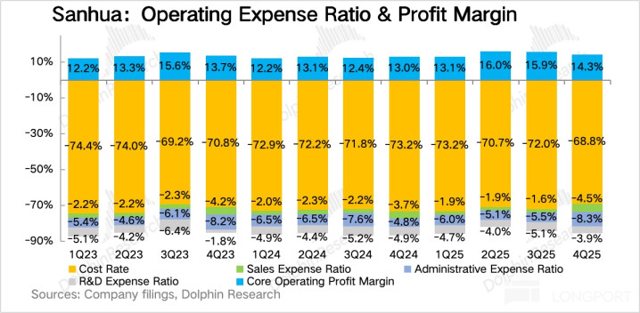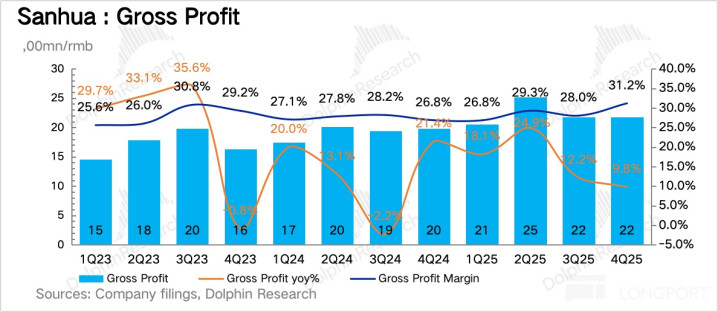 三花 Q4 单季毛利只须 22 亿,低于商场预期,主若是受收入不足预期的影响,但毛利率 31.2% 却创了新高,同比拉高 4pct,环比也升迁 3pct。