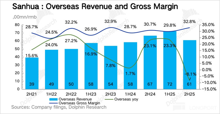 就下半年来看,三花 25 年下半年国外收入 61 亿元,同比下滑了 8%,所有值同比下滑了约 6 亿元。
