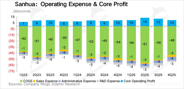 a. 惩办用度: 从东谈主员建树看,2025 年行政、财务东谈主员等皆有所减少,但惩办用度上尤其是薪酬用度增长却比较显豁,导致惩办用度走高,尤其是四季度,料到应该是年底奖金的密集开销所致。