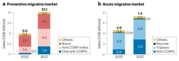 强大的患病基数以及千里重的疾病职守,共同构筑起偏头痛百亿级的药物市集。数据裸露,2022年环球偏头痛市集总价值已达96亿好意思元,瞻望2027年将达到175亿好意思元,雅博体育app其中注目性偏头痛市集瞻望价值101亿好意思元,复合年增长率为11.3%。