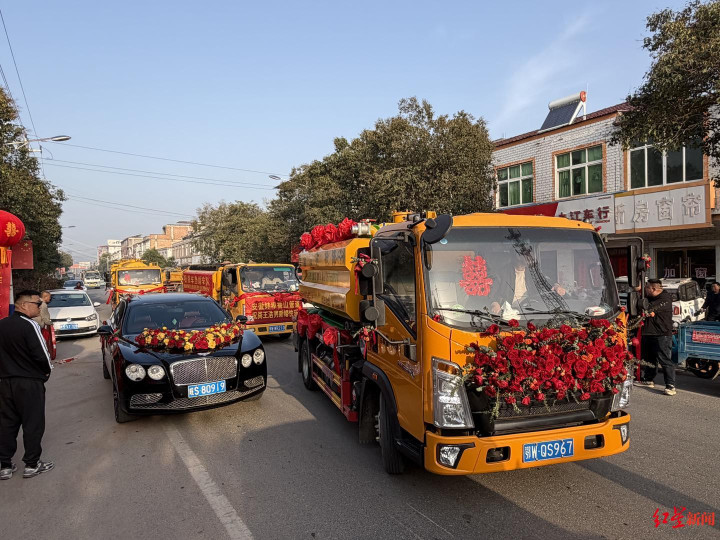 小九体育直播 "掏粪男孩"成亲 9辆吸粪车组队迎亲
