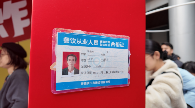 ▲“鸡排哥”李俊永在慈溪“巡炸”现场张贴餐饮从业东说念主员健康证。新京报贝壳财经记者俞金旻 摄