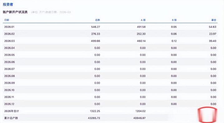 最新数据,2026年3月A股新开户数达460.14万户,环比激增82.38%,同比高潮50.10%。